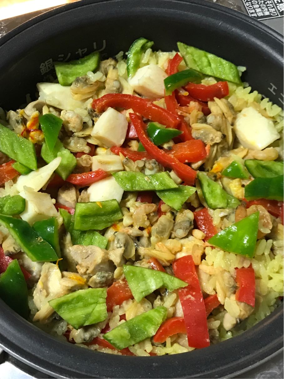冷凍シーフードミックス・鶏モモ肉・パプリカを 入れて