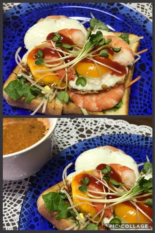 サラダと 目玉焼きと 海老を 乗せました