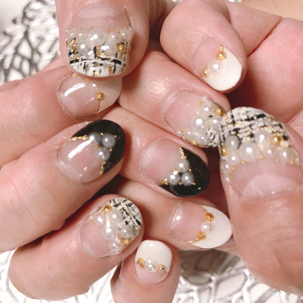 今回は 白と黒のツイード柄と パール