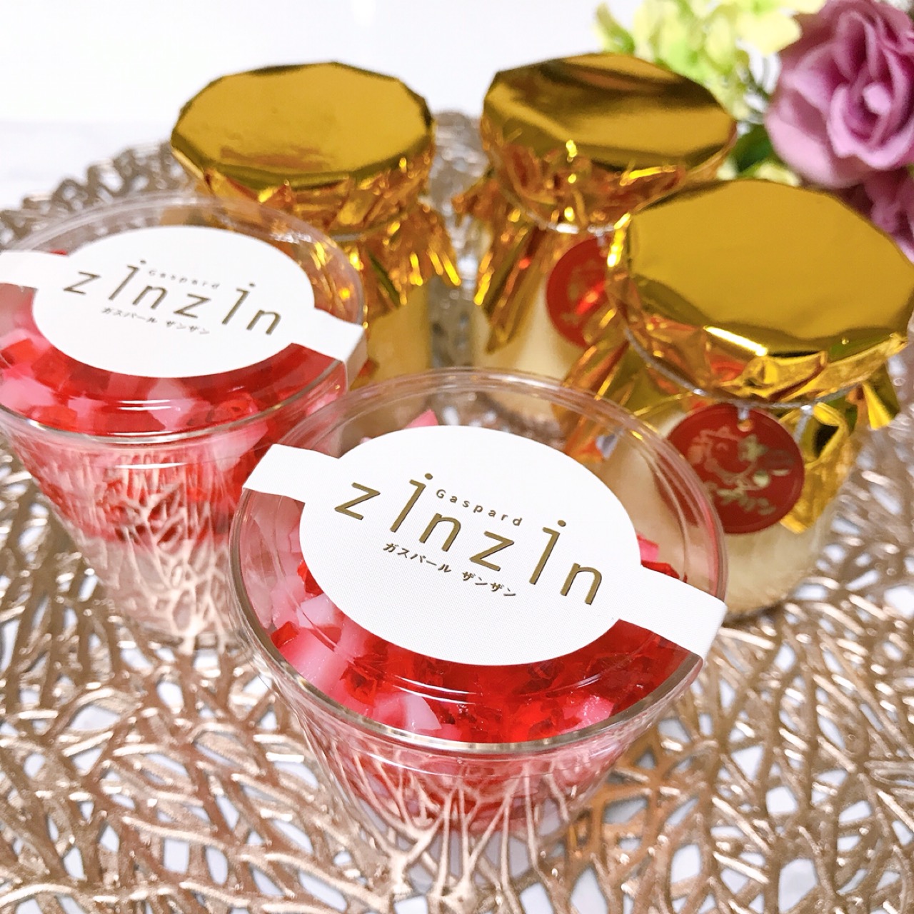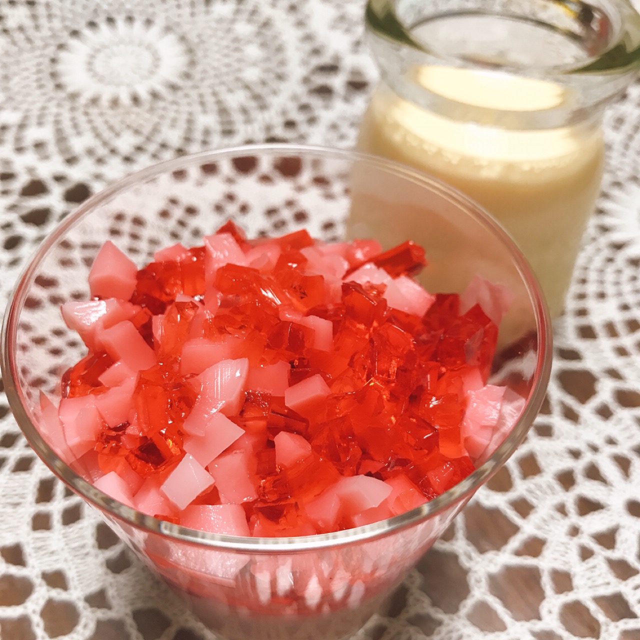 いちごプリンの上に クラッシュゼリーが乗っていて