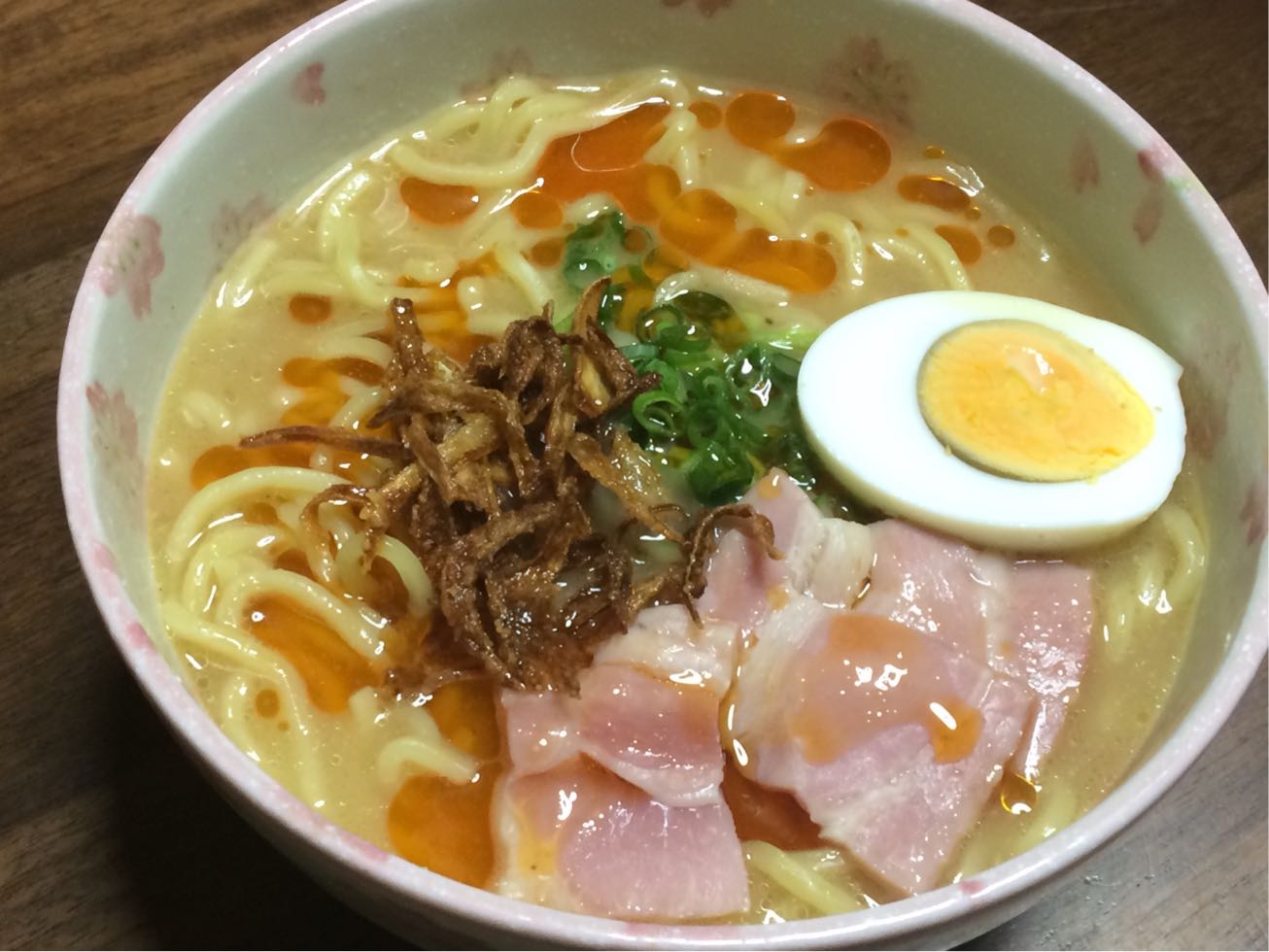 茹で卵と 青ネギと ベーコン....と フライドオニオン